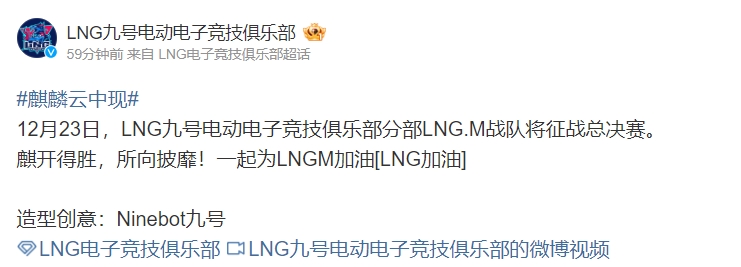 12月21日消息今日,LNG官博分享英雄联盟赛区选手为LNG加油的消息。 LNG.M赛区的队伍将参加决赛。