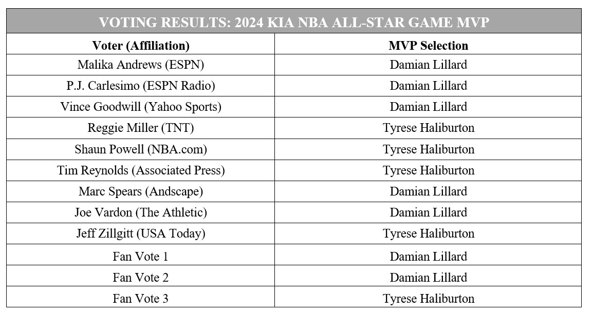 官方公布了全明星MVP投票详情:利拉德7票VS哈利伯顿5票。