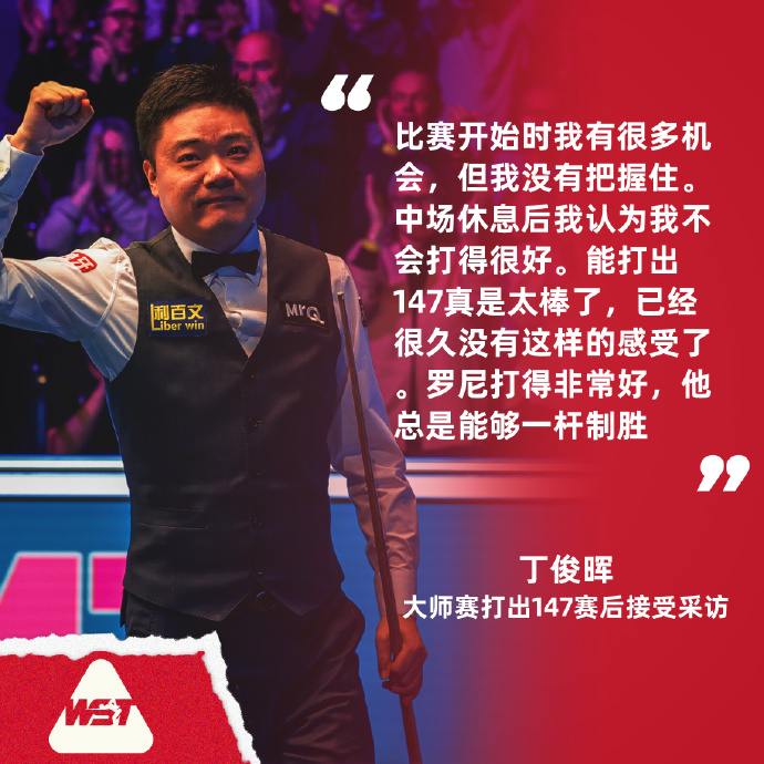 赛后丁俊晖接受采访时表示:比赛一开始我有很多机会,但我没有把握住。半场结束后,我不认为自己会打得很好。能打到147真是太棒了,我已经很久没有这样的感觉了。