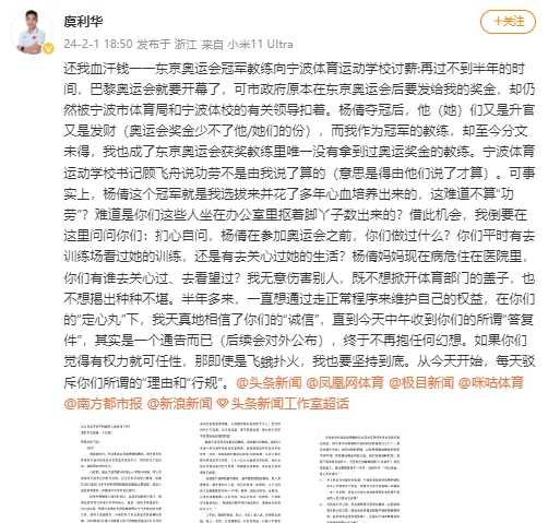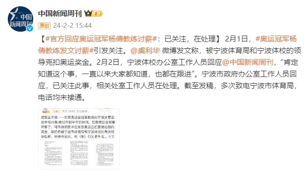 奥运冠军教练杨谦薪资要求官方回应:已关注 正在处理