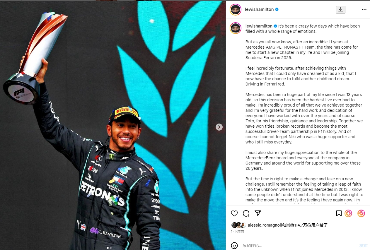 但正如您现在所知,在梅赛德斯度过了令人难以置信的11 年之后,我将在2025 年加入法拉利,开启人生的新篇章。