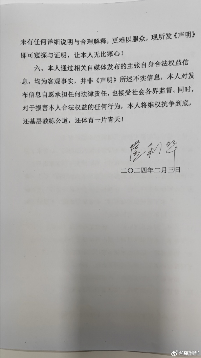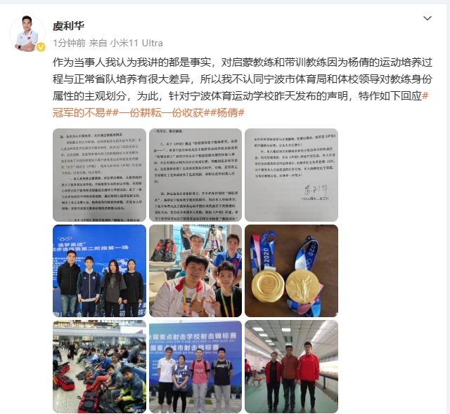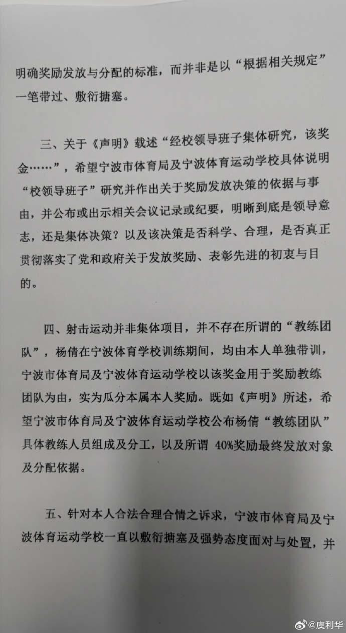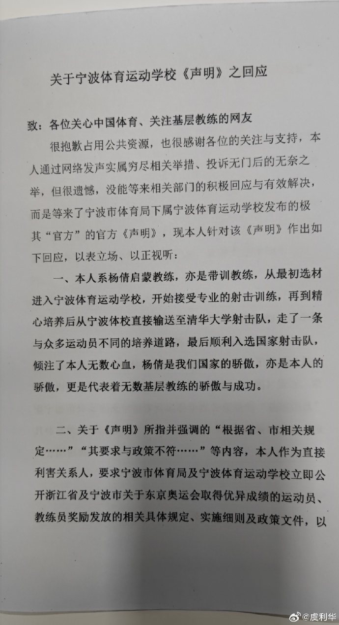 余丽华写道:作为当事人,我认为我说的是事实。关于启蒙教练和训练教练的问题,由于杨谦的运动训练过程与正常的省队训练有很大不同,所以我不太同意宁波市体育局和体校的说法。领导者对教练员身份属性的主观分类。为此,对宁波市体校昨天发表的声明作出如下回应。