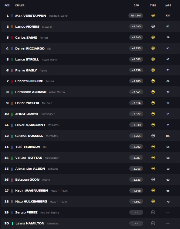 周冠宇目前在场上排名第10,领先于队友博塔斯。此外,维斯塔潘仍然领先。