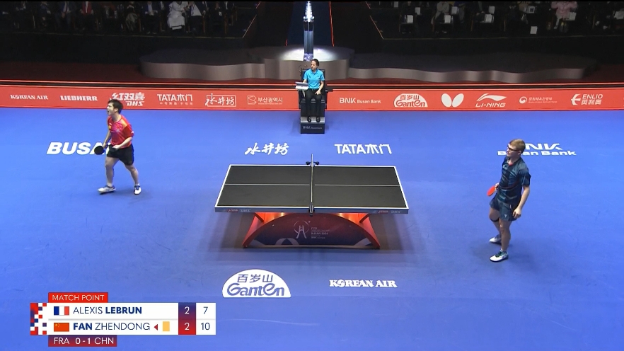 2月25日:釜山世乒赛男子团体决赛,中国vs 法国。第二场比赛,樊振东以3-2(9-11、11-4、8-11、12-10、11-7)逆转亚历克斯勒布伦,男队2-0领先中国010- 63064。
