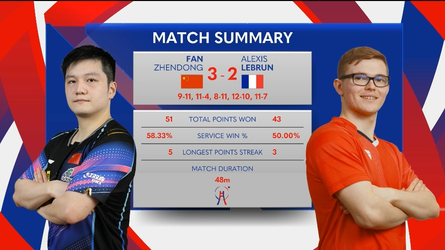 首局樊振东8-4领先但被9-11逆转,随后迅速以11-4扳平比分。第三局,樊振东以5-10挽救了3个局点,但仍以8-11再输一局。