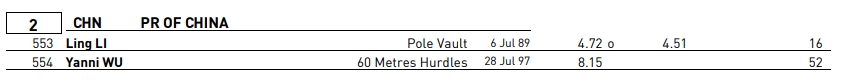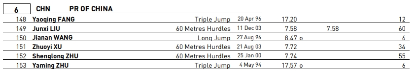 中国团体参赛名单:王嘉楠(跳远)、朱亚明、方耀庆(三级跳远)、刘俊谦、朱胜龙、徐卓毅、吴燕妮(60m栏)、李玲(撑竿跳高)