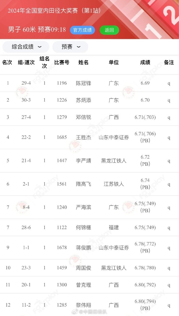 苏炳添6秒70复出首秀!全国室内田径大奖赛60米预赛苏炳添获得第二名