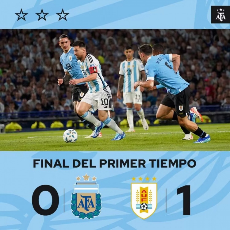 11月17日讯 北京时间11月17日08:00,世界杯预选赛南美区第5轮阿根廷迎战乌拉圭的比赛,上半场努涅斯低射造险,阿劳霍爆射破僵局,双方火药味浓厚梅西锁喉对手,半场结束,阿根廷0-1乌拉圭。