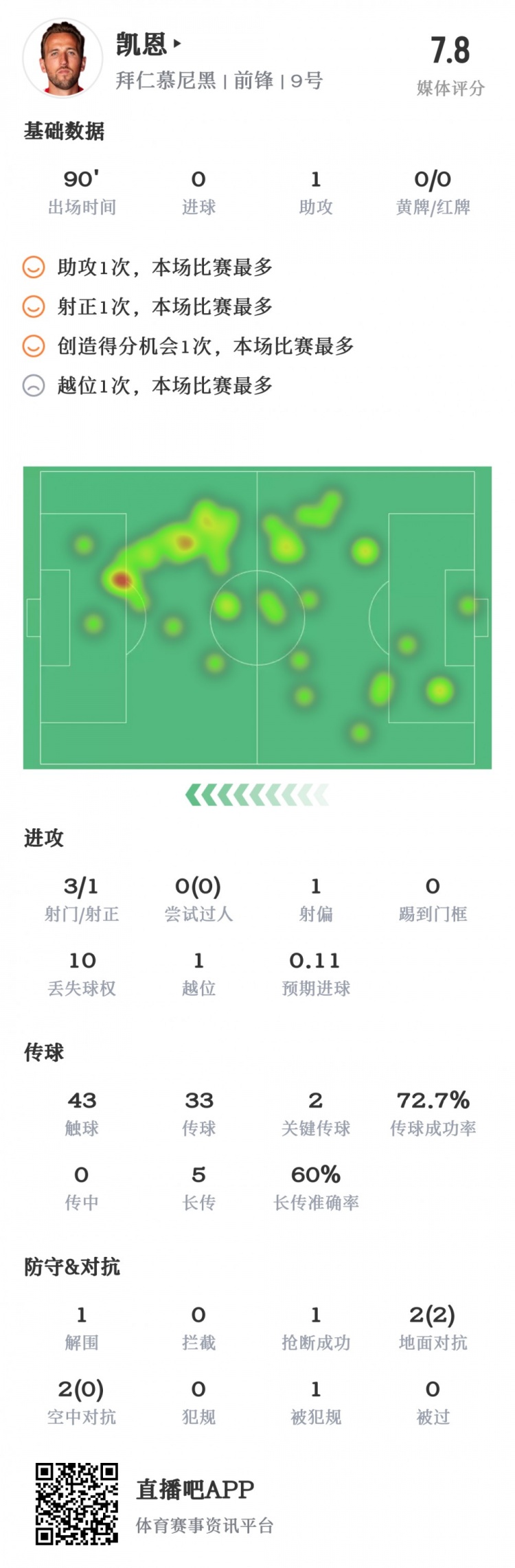 标题凯恩数据:赢球助攻 3投1中 关键传球2次 评分7.8分