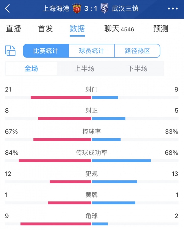 海港vs 三镇数据:射门21 比8 控球率67% 比33% 海港总体占优