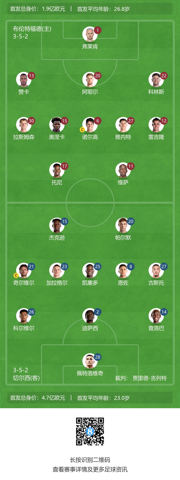 布伦特福德首发:1-弗莱肯、13-赞卡、20-阿耶尔、22-柯林斯、12-雷吉隆、30-罗斯勒夫、6-诺尔高、27-雅内特、15-奥涅卡、11-维萨、17-伊万-托尼
