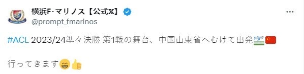 横滨水手官方社交媒体账号写道:“2023-24赛季亚冠四分之一决赛首回合比赛地点,山东省中国,出发吧!”